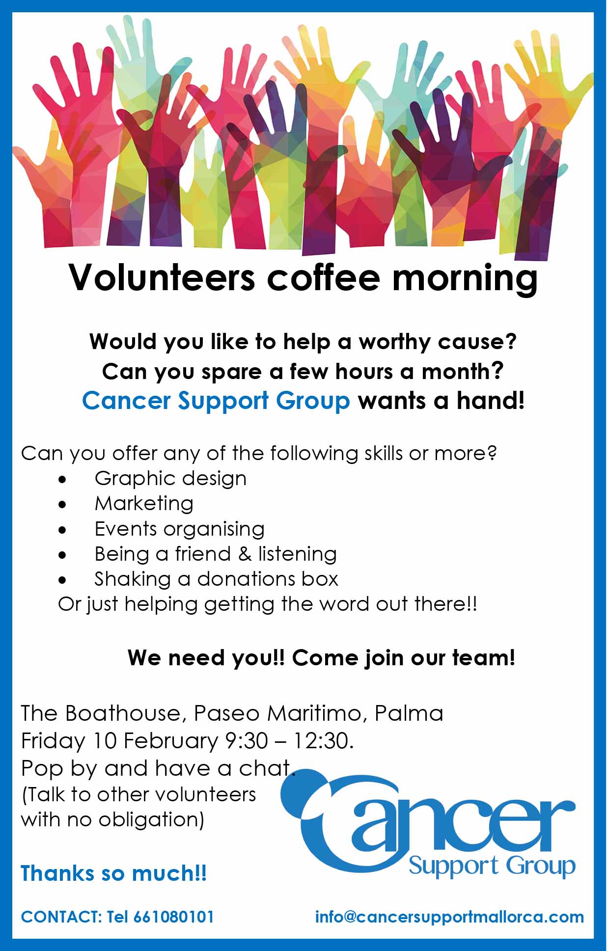 Volunteers coffee morning. Would you like to help a worthy cause? Can you spare a few hours a month? Cancer Support group wants a hand! February 10th 9:30am – 12:30pm, Paseo Maritimo, Palma.